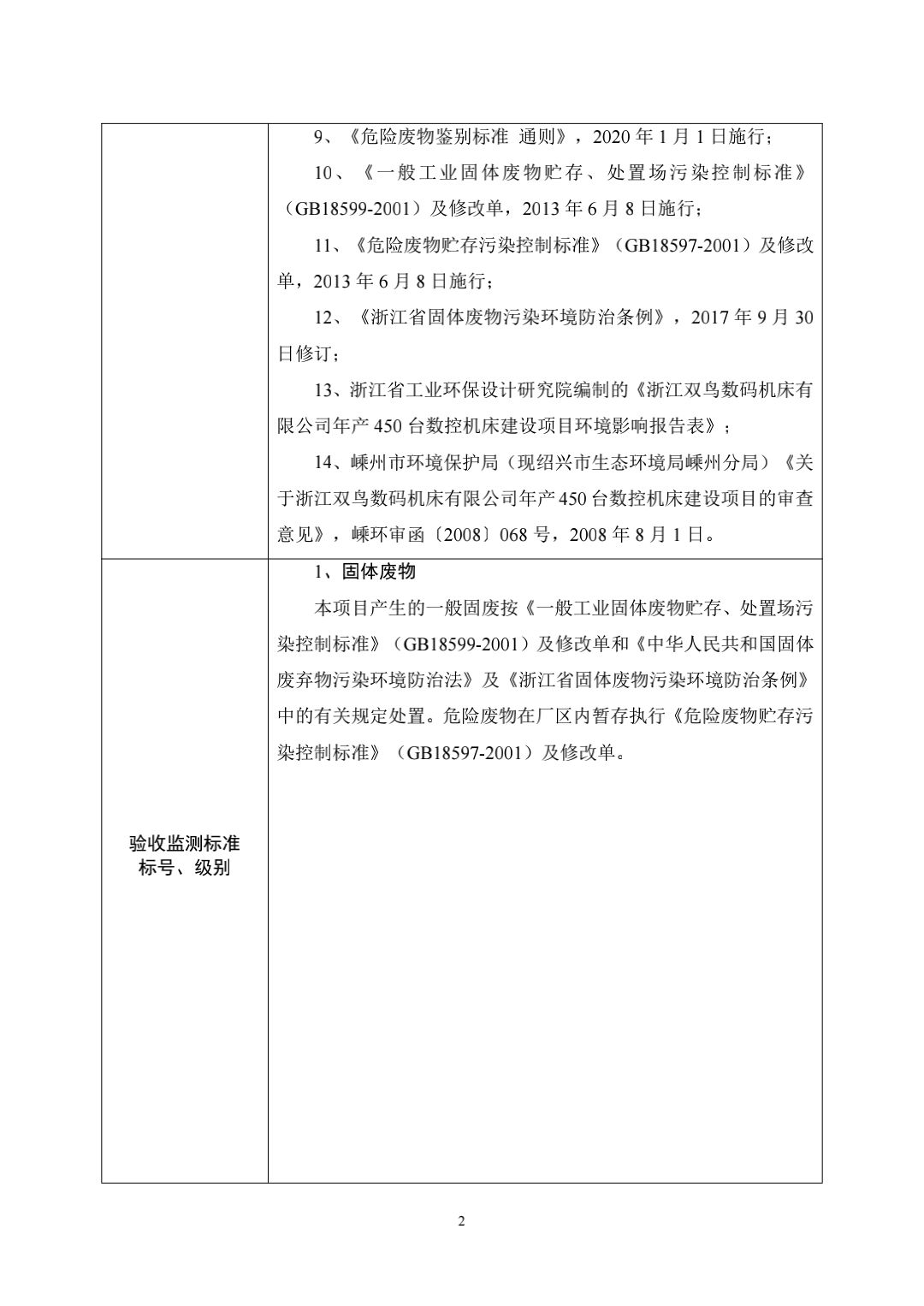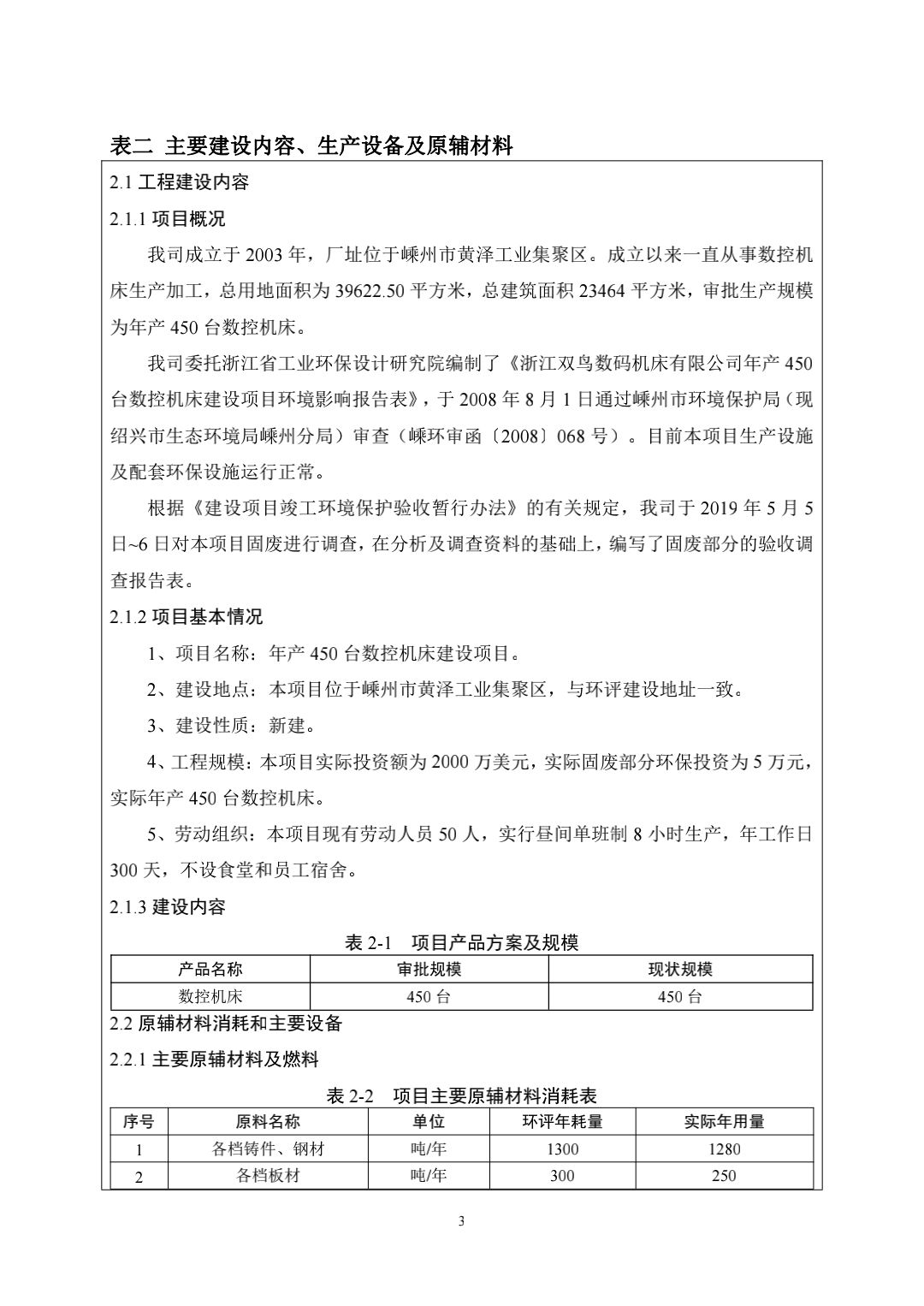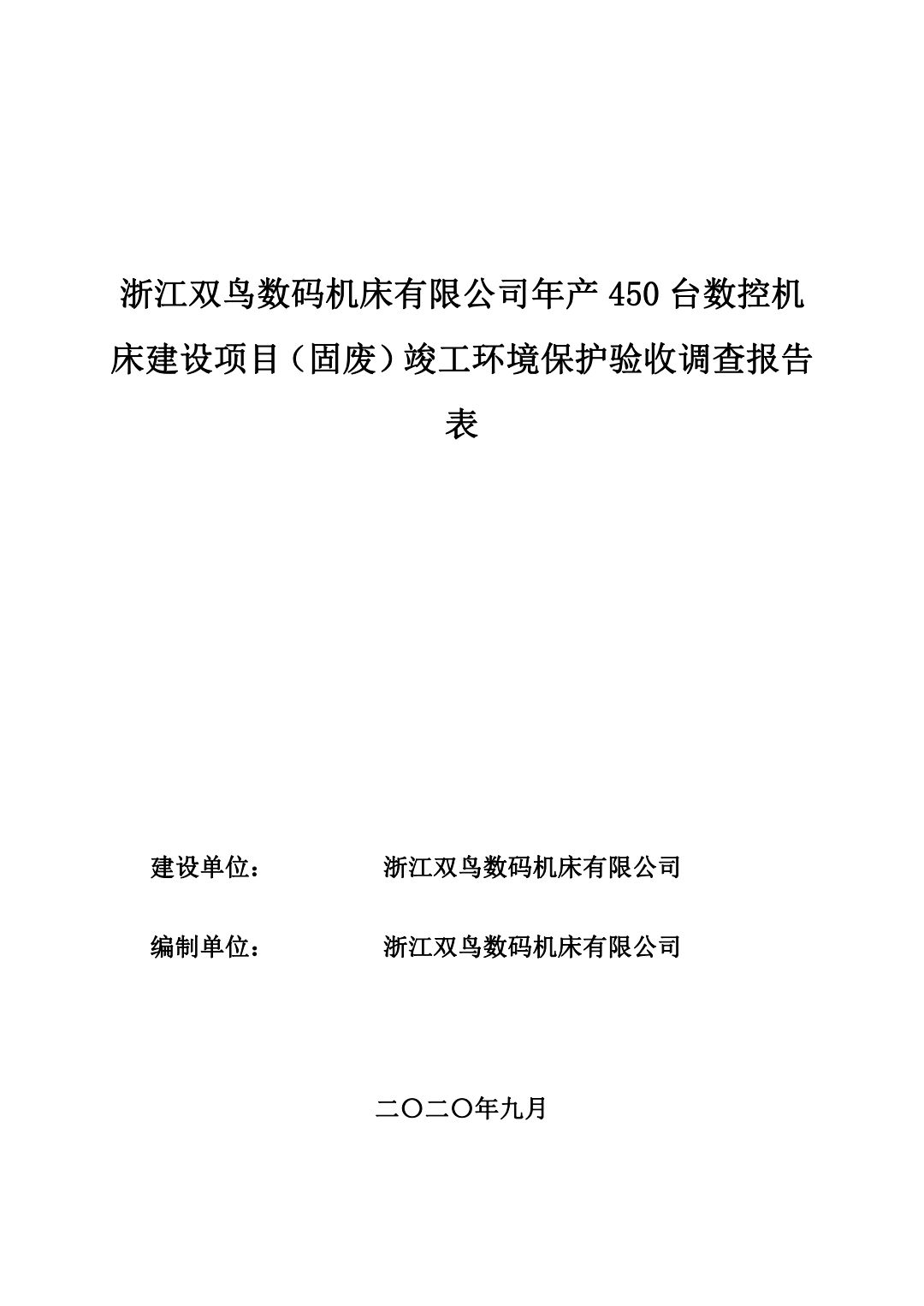 浙江雙鳥數碼機床有限公司年產 450 臺數控機床建設項目(固廢)竣工環境保護驗收調查報告 表